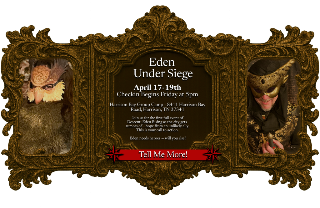Descent: Eden Rising is a dark high‑fantasy, story‑driven LARP set across Middle Tennessee, East Tennessee, and North Georgia — where every choice you make shapes the fate of a world on the brink.